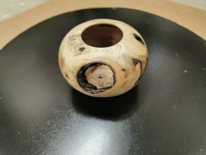 Eschenholz Windlicht in Kugelform. Wenn Astlöcher und Einschlüsse in der Baumkante im Stamm enthalten sind, erhält man solch herrliche Ergebnisse. Im Inneren kann ein XL Teelicht für außergewöhnliche Stimmung sorgen. Das Holz wurde mit transparentem Hartwachs endbehandelt.